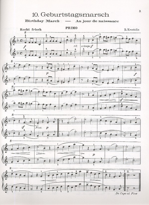 Krentzlin, Richard, ed Charakterstücke für das Vomblattspiel Geburtstagsmarsch (Krentzlin) Wiegenlied (Heller) Klein Elsbeth tanzt (Sartorio) Tirolerlied (Krentzlin) Morgenstimmung (Sartorio) Steyrischer Ländler (Heller) Auf auf zur fröhlichen Jagd (Heller)
