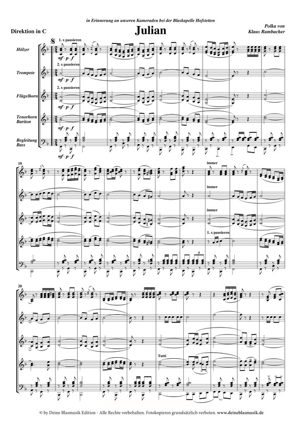 Polka Diese Polka für Blasorchester begeistert durch ihre musikalische Farbenvielfalt und Melodien, die abwechslungsreich instrumentiert gleichermaßen alle Register fordern. Klaus Rambacher widmete dieses Stück einem seiner Musikanten, "Julian", der, bevor er viel zu jung bei einem tragischen Unfall starb, mit großer Lebensfreude, Spaß und musikalischem Talent seine Kollegen erfreute.