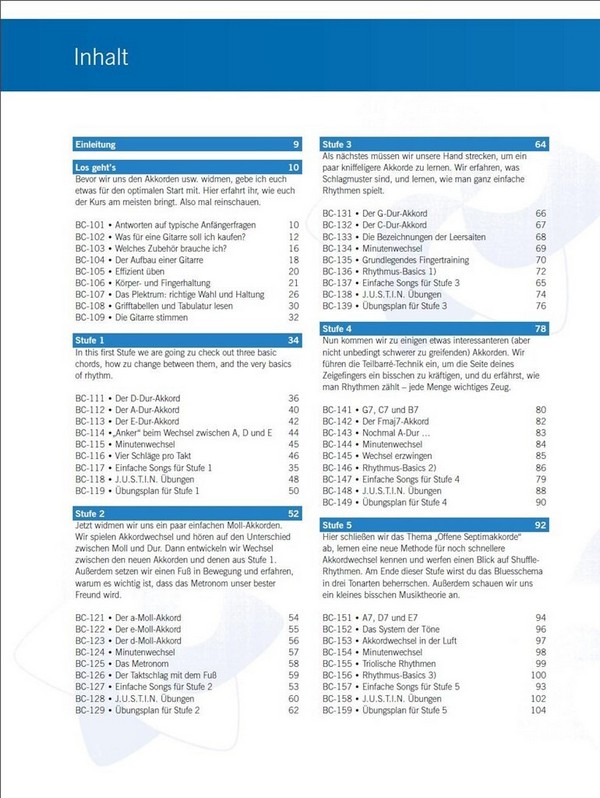 Justinguitar.com Dieses Buch bietet einen umfassenden Einsteiger-Kurs für alle, die Akustik- oder E-Gitarre lernen möchten. Der Autor Justin Sandercoe greift dabei auf seine fast 20-jährige Unterrichtserfahrung zurück, in der er erkannte, dass sich fast alle dieselben Fragen stellen. Mit diesem Werk liefert er die Antworten. Es ist in neun Abschnitte unterteilt, die den Neuling herausfordern, aber nicht überfordern. Die genauen Inhalte siehst du links in den Beispielbildern. Dazu kommen regelmäßige Übungsabschnitte und Gehörtraining sowie Tipps zur Auswahl der eigenenGitarre. Man lernt das Lesen von Akkorden und Griffe, das Stimmen des Instruments und die wichtigsten Akkorde und Rhythmen. Abgerundet wird der Kurs mit dem Einstieg in Blues-Schemata und grundlegende Improvisationsmuster. Videos auf justinguitar.com ergänzen das Lernen und die Arbeit mit den beiden beiliegenden CDs.