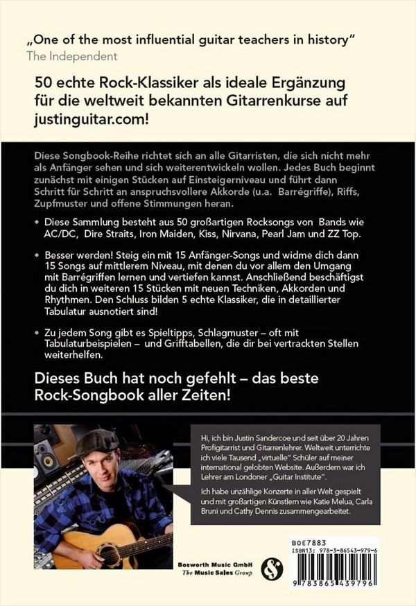 Der in Australien geborene und seit 1996 in London beheimatete Gitarrist, Songwriter, Produzent und Musiklehrer Justin Sandercoe ist laut der renommierten britischen Tageszeitung The Independent einer der einflussreichsten Gitarrenlehrer der Geschichte. Sein Justinguitar.com Rock-Songbook ist ideal für alle, die über das Anfänger-Niveau hinausgehen wollen. Das Buch beginnt mit leichteren Stücken, bevor komplexere Harmonien und Barré-Akkorde, Riffs, Zupftechniken und offene Stimmungen eingeführt werden. Jeder Song wird begleitet von Spieltipps, Hinweisen zu Anschlagtechniken, oft mit Tabulatur und Griffbildern, um so durch schwierigePassagen zu helfen. Sandercoes Werk ist also viel mehr als nur ein Songbook. Im Buch finden sich 50 großartige Rocksongs von Künstlern wie AC/DC, Dire Straits, Iron Maiden, Kiss, Nirvana, Pearl Jam und ZZ Top. Gerade die Mischung aus brillantem Lehrwerk und bekannten Hits macht die Justinguitar.com-Serie derart erfolgreich. Justinguitar.com Sandercoe, Justin, ed 50 großartige Rocksongs Highway to Hell Every Rose has its Thorn If You tolerate this Your Children will be next La Grange In Bloom Rock and Roll all Nite There she goes Self Esteem Sunshine of your Love Should I stay or should I go Smells like Teen Spirit Song 2 Teenage Kicks The Ballad of Jayne I remember You Alison Creep Behind blue Eyes Better Man Born to be wild Don't fear the Reaper Don't look back in Anger Handbags and Gladrags Hells Bells Don't stop Believin' I love Rock 'n' Roll Smoke on the Water So far away White Wedding You do something to me Alive All my Life All right now Back in black Black Hole Sun Just the Way I'm feeling Hole hearted Iris Where is my Mind Killing in the Name My Sharona Run to the Hills Since You've been gone Steady as she goes The Boys are back in Town Sultans of Swing Sweet Home Alabama You shook me all Night long Black Betty