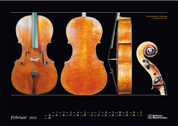Edition Bochinsky Der Kalender Meisterwerke des Geigenbaus 2022 zeigt eine Auswahl an Streichinstrumenten der berühmtesten Geigenbaumeister in bestechend detailgenauen Fotografien. Der Kalender setzt 2022 den Fokus auf die bedeutendsten Geigenbauer aus den einflussreichsten europäischen Geigenbauwerkstätten des 18. und 19. Jahrhunderts. Darunter befinden sich Violinen von Größen wie Giuseppe Guarneri, John Frederick Lott II und Giovanni Battista Ceruti. Folgende Violinen, Violas und Cellos sind im Kalender enthalten: Alexandre DEspine, 1828 Jean-Baptiste Vuillaume, 1829 Jean-Baptiste Vuillaume, 1867 Joseph Hel, 1877 Johannes Theodorus, 1794 Vincenzo Panormo, 1790 Bernhardt Simon Fendt, date unknown John Lott, 1860 Franz Geissenhof, 1817 Martin Stross, 1825 Giovanni Battista Ceruti, 1808 Giuseppe Guarneri, 1734