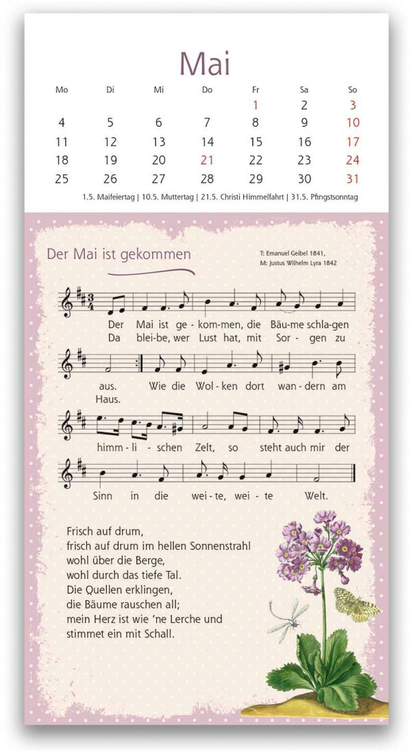 Volkslieder im Jahreskreis 12 Lied-Postkarten zum Heraustrennen Die schöne Tradition der Liedpostkarte, die vom Erzgebirge über Bayern bis nach Österreich populär war, erweckt dieser Kalender zu neuem Leben. Zwölf beliebte Volkslieder sind auf je einer Monatspostkarte im Vintagelook mit Noten, Liedtext und einer nostalgischen Illustration von Maria Sibylla Merian gestaltet. Ob Sie die Lieder selbst singen oder als musikalischen Gruß mit der Post verschicken - Volkslieder wie »Im Märzen der Bauer« und »Auf auf ihr Wandersleut« sorgen auf jeden Fall für gute Stimmung.