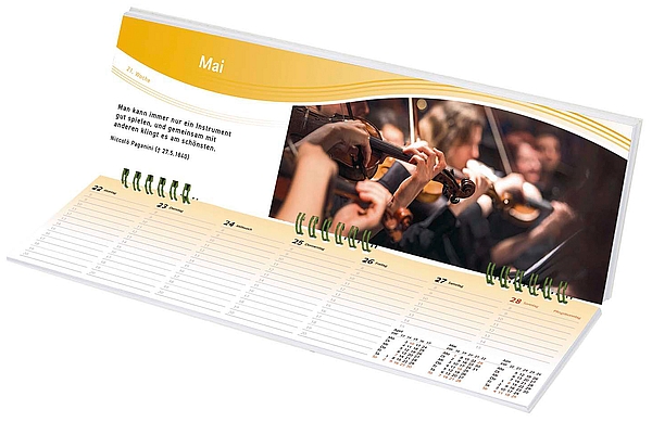 harmonisches Innenlayout viel Platz für Eintragungen und Notizen Hinweise auf musikalische Gedenktage Dieser praktische Schreibtischkalender zum Aufstellen bringt Übersicht in Ihren Terminplan: Er bietet ausreichend Platz fur Ihre persönlichen Eintragungen. Stimmungsvolle Fotos ergänzen das attraktive Layout. Passende Zitate und Verweise auf musikalische Gedenktage regen jede Woche dazu an, sich in allen Lebenslagen von Musik begleiten zu lassen, egal ob in Dur oder Moll.