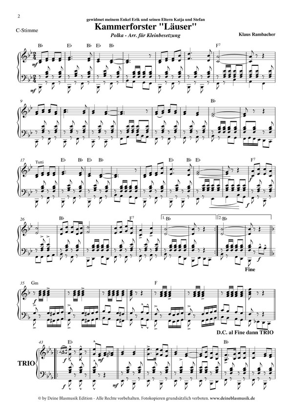 Die leicht spielbare Polka, die von Rambacher selbst farbenreich instrumentiert wurde, besticht durch ihre eingängigen Melodien und ein wunderschön zweistimmiges Trompetensolo.