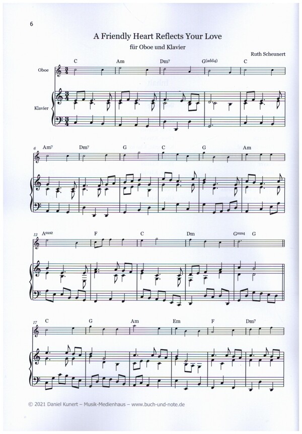 Der zweite Band der Rubrik 'Heiteres bis Besinnliches' mit kammermusikalischen Werken von Ruth Scheunert ist prall gefüllt mit wunderbarer und gar nicht schwerer Musik. Der Partitur liegen Stimmen für Klarinette in B, Oboe und Querflöte bei. A friendly heart reflects your love - Oboe, Klavier In God's Garden - Oboe, Klavier Pastorale - Oboe, Klavier Praise the Lord - Klarinette, KLavier Meditation mit Flöten - 2 Flöten, Klavier Prayer - Flöte, Klavier Relief - Oboe, Klavier Rêve - Somnium - Flöte, Klavier Sleeping in your arms - Flöte, Klavier We miss you - Shalom - Oboe, Klavier