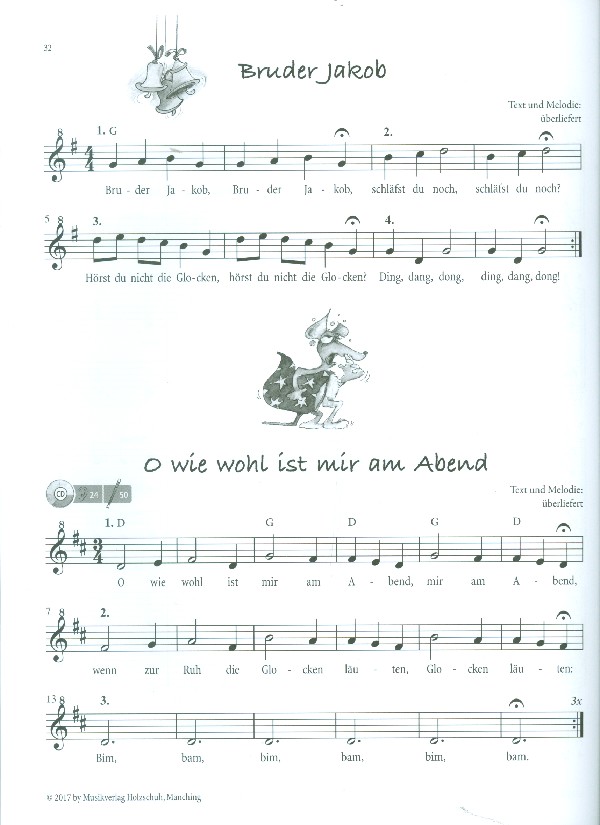 Jede Menge Flötentöne Ertl, Barbara, arr. A, a, a, der Winter, der ist da Alle Leut gehn jetzt nach Haus Alle meine Entchen Auf einem Baum ein Kuckuck Backe, backe Kuchen Bruder Jakob Der Herbst, der Herbst ist da Der Kuckuck und der Esel Die Blümelein sie schlafen Ein Männlein steht im Walde Ein Schneider fing 'ne Maus Ein Vogel wollte Hochzeit machen Es tanzt ein Bi-Ba-Butzemann Es war eine Mutter Frau Schwalbe ist 'ne Schwätzerin Fuchs, du hast die Gans gestohlen Hänschen klein Hänsel und Gretel Hopp, hopp, hopp Ich geh mit meiner Laterne In meinem kleinen Apfel Jetzt fahrn wir über'n See Jetzt fängt das schöne Frühjahr an Jetzt steigt Hampelmann Kuckuck, Kuckuck O wie wohl ist mir am Abend Ringel, Ringel, Reihe Spannenlanger Hansel Summ, summ, summ Suse, liebe Suse Trarira, der Sommer, der ist da Weißt du, wie viel Sternlein stehen Widele, wedele