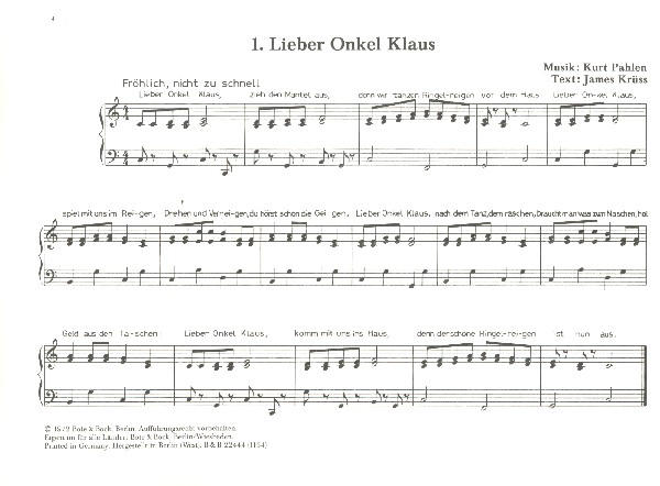 Lieber Onkel Klaus Die Fischer Morgenlied Das Fest der Tiere Das Lied der Weltraumfahrer Das Lied vom Weiterziehen Lied des Piratenkapitäns Tanzlied am Abend Das süße Fest von Bonbon-jo Weide und Welle Schwerenöterpeter Das Lied von der Kanone Lied vom zänkischen Papagei Sieben kleine Wäscherinnen Lied des indianischen Hirten Goldenes Lied zur Nacht