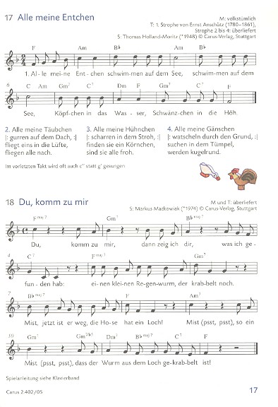 Trüün, Friedhilde, ed Mohr, Andreas, ed Lefrancois, Markus, Illustrationen Die schönsten deutschen Kinderlieder Es tönen die Lieder Zwei kleine Wölfe Horch, wie der Magen knurrt / Kohldampf Heut ist ein Fest Bruder Jakob Wer will fleißige Handwerker sehn In meinem kleinen Apfel Hänschen klein Ein Mann, der sich Kolumbus nannt Spannenlanger Hansel A B C, die Katze lief im Schnee Auf der Mauer, auf der Lauer Häschen in der Grube Auf einem Baum ein Kuckuck saß Alle Vögel sind schon da Hoppe, hoppe Reiter Sankt Martin Laterne, Laterne Auf de schwäbsche Eisebahne Meine Oma fährt im Hühnerstall Motorrad Ein Vogel wollte Hochzeit machen Grün, grün, grün sind alle meine Kleider Es war eine Mutter Kommt ein Vogel geflogen Ringel, Ringel, Reihe Brüderchen, komm, tanz mit mir Es tanzt ein Bi-Ba-Butzemann Heißa Kathreinerle Jimba, jimba Mein Hut, der hat drei Ecken Dornröschen war ein schönes Kind Dornröschen war ein schönes Kind Machet auf das Tor Taler, Taler, du musst wandern Laurentia Backe, backe Kuchen In dem Wald, da steht ein Haus Widewidewenne Eine kleine Geige möcht ich haben Ich brauche kein Orchester Ich bin ein Musikante Drei Chinesen mit dem Kontrabass Ich lieb den Frühling Ich geh mit meiner Laterne Ach bittrer Winter Winter, ade Hab ne Tante aus Marokko Hänschen klein ging allein Hänsel und Gretel Auf unsrer Wiese gehet was Ein Männlein steht im Walde Suse, liebe Suse Fuchs, du hast die Gans gestohlen Finster, finster Guten Morgen, good morning Backe, backe Kuchen Hopp, hopp, hopp Alle meine Entchen Alle meine Entchen Du, komm zu mir Jetzt fahrn wir über'n See Kuckuck, Kuckuck, ruft's aus dem Wald Summ, summ, summ Schneeflöckchen, Weißröckchen Wir werden immer größer Und wer im Januar geboren ist Bei meiner Tante Josefine Meine Biber haben Fieber In Mutters Stübele Hans-Jürgen Bareiss Heute kam ein Sommerbote / Zarter Mohn Wenn einer sagt: Ich mag dich, du O wie ist es kalt geworden Ich bin der Stimmakrobat Die Geige beginnet Wir kommen all und gratulieren Wenn ich glücklich bin Im Land der Blaukarierten Ich schenk dir einen Regenbogen Froh zu sein bedarf es wenig Trarira, der Sommer, der ist da Der Kuckuck und der Esel Ein Schneider fing 'ne Maus Alles Gute zum Geburtstag Das Auto von Lucio Der Cowboy Jim aus Texas Ein Mensch, der saß auf seinem Po Wenn die wilden Winde stürmen