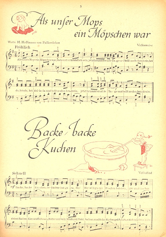 A B C die Katze lief im Schnee Alle Vögel sind schon da Alle meine Entchen Alles neu macht der Mai Als unser Mops ein Möpschen war Backe backe Kuchen Das Wandern ist des Müllers Lust Der Kuckuck und der Esel Der Mai ist gekommen Dort unten in der Mühle Drunten im Unterland Ein Männlein steht im Walde Es klappert die Mühle am rauschenden Bach Es tanzt ein Bi-Ba-Butzemann Fuchs du hast die Gans gestohlen Gestern abend ging ich aus Gold'ne Abendsonne Guten Abend gute Nacht Guter Mond du gehst so stille Häschen in der Grube Hänschen klein Hoppe hoppe Reiter Im Wald und auf der Heide Komm lieber Mai und mache Kommt ein Vogel geflogen Kuckuck Kuckuck rufts aus dem Wald Maikäfer fliege Morgen kommt der Weihnachtsmann Müde bin ich geh zur Ruh Muß i denn muß i denn zum Städtle hinaus Nun ade, du mein lieb Heimatland O Tannenbaum Ringel Ringel Reihe Schlaf, Herzsöhnchen Sah ein Knab' ein Rösle in stehn Stille Nacht heilige Nacht Summ summ summ Bienchen summ herum Suse liebe Suse Taler Taler du mußt wandern Trara Die Post ist da Üb immer Treu und Redlichkeit Weißt du wieviel Sternlein stehen Wem Gott will rechte Gunst erweisen Wenn ich ein Vöglein wär Winter ade scheiden tut weh Wollt ihr wissen wie's die kleinen Mädchen machen Zeigt her eure Füßchen
