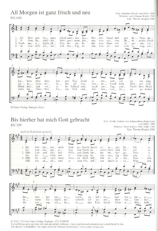 zu Liedern im Evangelischen Gesangbuch und Gotteslob All morgen ist ganz frisch und neu Bis hierher hat mich Gott gebracht Bleib bei mir, Herr der Abend bricht herein Brunn alles Heils, dich ehren wir Das sollt ihr, Jesu Jünger, nie vergessen Der Tag bricht an und zeiget sich Der Tag, mein Gott, ist nun vergangen Die güldne Sonne voll Freud und Wonne Die helle Sonn leucht' jetzt herfür Die Nacht ist vorgedrungen Dir, dir, o Höchster, will ich singen Du meine Seele, singe Erstanden ist der heilig Christ Es kommt ein Schiff, geladen Fröhlich soll mein Herze springen Fröhlich wir nun all fangen an Gelobt sei Gott im höchsten Thron Gottes Sohn ist kommen Heilger Geist, du Tröster mein Herr, dein Wort, die edle Gabe Himmel, Erde, Luft und Meer Ich freu mich in dem Herren Ich singe dir mit Herz und Mund Ich weiß, mein Gott, dass all mein Tun Ich weiß, woran ich glaube Ich will dich lieben, meine Stärke Jerusalm, du hochgebaute Stadt Jesu, meines Lebens Leben Jesus ist kommen, Grund ewiger Freude Komm, Herr, segne uns Komm, o komm, du Geist des Lebens Lobet den Herren alle, die ihn ehren Lobt Gott den Herrn, ihr Heiden all Macht hoch die Tür Meinen Jesus lass ich nicht Morgenglanz der Ewigkeit Nun jauchzt dem Herren, alle Welt O dass ich tausend Zungen hätte O Gott, du frommer Gott O Heiland, reiß die Himmel auf O Heiliger Geist, o heiliger Gott O Jesu Christe, wahres Licht Singt, singt dem Herren neue Lieder Steht auf, ihr lieben Kinderlein Such, wer da will, ein ander Ziel Sonne der Gerechtigkeit Tut mir auf die schöne Pforte Wie soll ich dich empfangen Wir danken dir, Herr Jesu Christ Wir glauben Gott im höchsten Thron Wunderbarer König