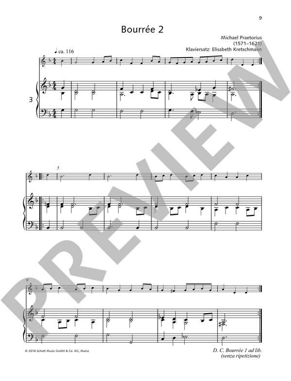 Kretschmann, Eliabeth, ed 29 leichte Stücke Rondo (Susato) Bourrée 1 und 2 (Praetorius) Allemande (Schein) La Bergamasca (Uccellini) Argeers (Playford) Prélude (Charpentier) Menuett (Fischer) Air (Delalande) Contredance (Delalande) Contredance (Delalande) Allegro aus Frühling (Vivaldi) Aira aus Bauernkantate (Bach) Bourrée aus Wassermusik (Händel) La réjouiccance aus Feuerwerksmusik (Händel) Sarabande aus Rinaldo (Händel) Bourrée (Hasse) Bourlesque (Mozart, L.) Andante aus Sinfonie mit dem Paukenschlag (Haydn) Eine kleine Nachtmusik Thema (Mozart) Der Vogelfänger bin ich ja (Mozart) Freude schöner Götterfunken (Beethoven) Für Elise (Beethoven) La donna è mobile (Verdi) Cancan aus Orpheus in der Unterwelt (Offenbach) Guten Abend gut' Nacht (Brahms) Schwanensee Thema (Tschaikowsky) Morgenstimmung (Grieg) Pomp and Circumstance March (Elgar) To a wild Rose (MacDowell)