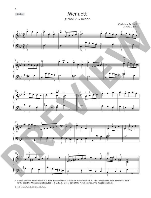 Nachfolgeartikel für ED21905 52 leichte Klavierstücke Johann Pachelbel: Fuga C-Dur Johann Kaspar Ferdinand Fischer: Praeludium Harpeggiato Christian Petzold: Menuett G-Dur Menuett g-Moll Jean-Philippe Rameau: Menuet D-Dur Georg Friedrich Händel: Sarabande d-Moll Gavotte G-Dur Johann Sebastian Bach: Menuet d-Moll Marsch D-Dur Menuet G-Dur Musette Praeludium C-Dur BWV 939 Praeludium c-Moll BWV 999 Praeludium C-Dur BWV 846 Muzio Clementi: Sonatine C-Dur Wolfgang Amadeus Mozart: Menuet G-Dur Menuet F-Dur Allegro B-Dur KV 3 Rondeau KV 15d Thomas Attwood: Sonatine G-Dur Ludwig van Beethoven: Sonatine G-Dur Sonatine F-Dur op. 36/1 Für Elise Bagatelle op. 119/1 - Henri Bertini: Präludium Friedrich Burgmüller: Arabesque Unruhe op. 100/18 Ballade op. 100/15 Frédéric Chopin: Prélude op. 28/4 Valse op. posth. Robert Schumann: Trällerliedchen Choral Kleine Studie op. 68/14 Wilder Reiter op. 68/8 Soldatenmarsch op. 68/2 Fröhlicher Landmann op. 68/10 Erster Verlust op. 68/16 Träumerei op. 15/7 Cornelius Gurlitt: Thema mit Variation aus op. 228 César Franck: Les Plaintes dune Poupée Peter Iljitsch Tschaikowsky: Altfranzösisches Lied op. 39/16 Die kranke Puppe op. 39/6 Süße Träumerei op. 39/21 - Claude Debussy: Le petit nègre Alexander Gretchaninoff: Njanja ist krank Wiegenlied Der kleine Gernegroß op. 119