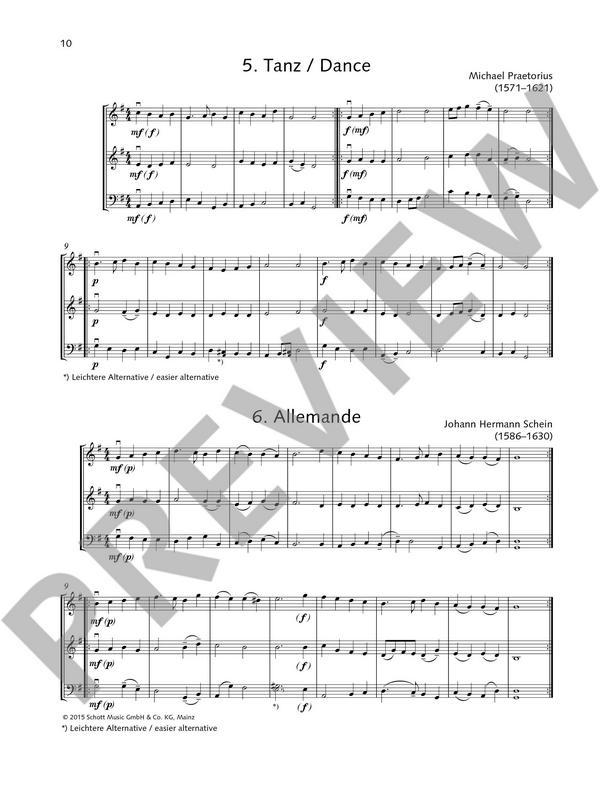 Mohrs, Peter, ed 36 leichte Stücke Rondo e Saltarello (T. Susato) Ballo Furlano (G. Maineiro) Allemande (M. Mersenne) Les Bouffons (T. Arbeau) Tanz (M. Praetorius) Allemande (J.H. Schein) Marsch (J.C.F. Fischer) Rigaudon (J.C.F. Fischer) Bourrée (Anonymus) Menuett (H. Purcell) Rigaudon (J.C. Pez) Menuett (J.C. Pez) Air (Anonymus) Menuett (Anonymus) Marsch (Anonymus) Bourrée (J.C. Faber) Air (J.C. Faber) Marsch (J.C. Faber) Allegro aus Der Herbst (A. Vivaldi) Allegro aus Der Frühling (A. Vivaldi) Menuett aus Feuerwerksmusik (G.F. Händel) Gavotte (G.F. Händel) Marsch der Perser (G.F. Händel) Andante aus Sinfonie mit dem Paukenschlag Nr.94 (J. Haydn) Deutscher Tanz (J. Haydn) Presto aus Wiener Trio Nr.1 (J. Haydn) Allegretto (J.B. Vanhall) Cantabile (J.B. Vanhall) Allegro (J.B. Vanhall) Der Vogelfänger bin ich ja aus Die Zauberflöte (W.A. Mozart) Menuett aus Don Giovanni (W.A. Mozart) Freude, schöner Götterfunken aus 9.Symphonie (L.v. Beethoven) Wiegenlied (F. Schubert) Choral (R. Schumann) Wiener Walzer (J. Strauß) Moderato (C. Dancla)