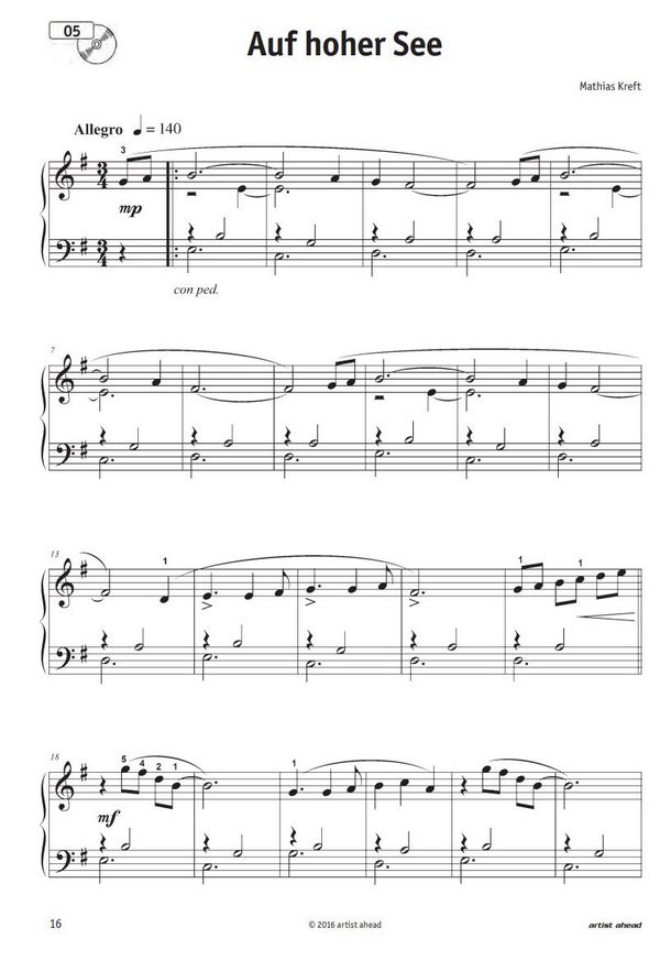 15 leichte Lieblingsstücke für jede Gelegenheit Walzer in a-Moll Pustekuchen Strandgut Avalon Auf hoher See Siesta Zwischenräume Strandläufer Fliegende Fische Indigo Nordlicht Rückenwind Heiter bis wolkig Urlaub am Meer Zeitreisen Die Reihe Klavier-Horizonte versteht sich als motivierendes Ergänzungsrepertoire zu gängigen Klavierschulen. Die Stücke bieten viel Klangerlebnis bei vergleichsweise geringem technischen Schwierigkeitsgrad. Klanglich orientiert sich die Musik an Popmusik, Filmmusik sowie Impressionismus und Minimal Music. Damit bieten diese Stücke in Klangfarbe und technischen Grundlagen eine gute Vorbereitung auf die schwerer spielbare Musik beliebter moderner Komponisten oder auch Songbooks und populärer Filmmusik-Notenbücher. Klavier-Horizonte - Band 1 ist vom Schwierigkeitsgrad (Horizont 1-2) für Schüler ab dem 2. Unterrichtsjahr geeignet. Die Horizont-Spielstufen beziehen sich auf ein 9-stufiges System: H1: frühe Anfänger, H2: Anfänger, H3: fortgeschrittene Anfänger, H4: frühe Mittelstufe, H5: Mittelstufe, H6: fortgeschrittene Mittelstufe, H7: frühe Fortgeschrittene, H8: Fortgeschrittene, H9: weit Fortgeschrittene. Einfaches Tonleiterspiel, das Greifen von Dreiklängen und erste Erfahrungen mit rhythmisch unabhängigem Spiel der Hände werden vorausgesetzt. Die Stücke sind über weite Strecken komfortabel im Fünf-Finger-Tonraum komponiert. Sie haben keine oder nur wenige Vorzeichen und sehr selten Vorzeichenwechsel. Die Fingersätze sind in den Noten vermerkt und Pedaleinsätze sind nur dann eingetragen, wenn sie im Verlauf der Stücke variieren. Die Kompositionen in Klavier-Horizonte - Band 1 sind zudem auch für kleinere Hände bestens geeignet. Durch den vergleichsweise geringen technischen Spielaufwand entsteht mehr Raum für Ausdruck und Spaß am Spiel. Die Stücke sind, nach bisherigen Erfahrungen im Unterricht, bei Kindern sowie Erwachsenen sehr beliebt und eignen sich perfekt zum Vorspiel bei familiären Anlässen oder bei Freunden. Der optionale Download dient als praktische Lernhilfe, um den Ausdruck und die richtige Artikulation nachvollziehen zu können. Auch als Soundtrack für unterwegs ist Klavier-Horizonte ein wahrer Genuss. Download-Material & Audio-CD Unter www.artist-ahead-download.de stehen die enthaltenen Klavierstücke als Audio- und MP3-Dateien zum Download zur Verfügung.