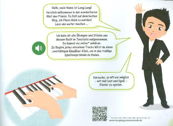 Lang Lang Piano Academy The Piano Method Lang Lang als weltweit erfolgreichster und populärster Konzert- Pianist anerkannt möchte mit seiner bei Alfred Music erschienenen Lang Lang Klavierschule für Kinder seine Leidenschaft für das Klavierspiel mit Klaviereinsteigern teilen. Sein außergewöhnliches Talent und Charisma hat bereits Millionen Menschen für das Klavierspiel begeistert. Allein in China wird dem Lang Lang-Effekt zugeschrieben, über 40 Millionen Kinder zum Klavierlernen ermuntert zu haben. In dieser neuartigen, deutschsprachigen Klavierschule für Kinder zeigt er Anfängern am Piano seine Welt des Klavierspiels und nimmt sie mit zu außergewöhnlichen Piano-Abenteuern! Und das auf eine einzigartige und fantasievolle Weise: Schritt für Schritt, in drei Bänden und mit online verfügbaren Hörbeispielen, auch zum Download. Von Anfang an gibt es viel auf der Klaviertastatur zu entdecken. Die lustigen und einfallsreichen Klavierstücke fördern die gleichberechtigte Entwicklung beider Hände, bereiten Spaß und Vergnügen und stärken die innere Vorstellungskraft. Begleitende Audiobeispiele mit exklusiven Einspielungen von Lang Lang selbst fördern den Lernprozess. Praktische Anwendungen der musiktheoretischen Inhalte sowie Lang Langs Aufnahmen von Pianoklassikern für Kinder tragen entscheidend zur Entfaltung der Musikalität bei. Das durchgehend vierfarbige Layout der ersten beiden Bände mit vielen ansprechenden Illustrationen tragen zusätzlich zur Motivation bei. Und zum Abschluss jedes Bandes steht jedem Kind eine ganz persönliche Lehrer-Urkunde zur Verfügung. Band 2 führt die Methodik von Band 1 konsequent fort, erweitert den Tonraum auf eine Oktave, widmet sich der Vertiefung von Achtelnoten, Dynamik und Artikulationstechniken. Neu eingeführt werden Vorzeichen, Daumenuntersatz, Fingerübersatz, Tonleitern und Tonarten. Alles durchgehend vierfarbig gedruckt mit attraktiven Illustrationen.