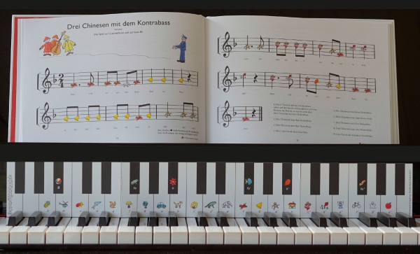 ersetzt 9788799566716 Schoeller Olsen, Sandra, Illustrationen für Kinder, Eltern und Großeltern mit Tastenschablone 33 bekannte Kinderlieder Spielmaterial für 18 musikalische Spiele Videomodul zum Buch gratis erhältlich auf www.klavierundspass.de In unserem digitalen Zeitalter sind Kinder durch iPads und Smartphones sehr an Figuren gewöhnt. Dieses Prinzip wurde auch als Ausgangspunkt für das Klavier lernen mit unserer Methode gewählt. Jede Figur stellt einen musikalischen Baustein dar. Lehrmethode mit Tastenschablone Denn in Klavierspiel & Spaß werden die traditionellen Noten durch bunte Figuren ersetzt, wobei die jeweilige Figur auf den Notennamen verweist. Die Note c wird zum Clown, f zum Flugzeug usw. Eine eigens hierfür entwickelte Tastenschablone, die ganz einfach hinter die Tastatur des Klaviers geklemmt wird, hilft die richtigen Figuren zu finden. Figurenwelt + bekannte Kinderlieder = Spaß Das Notenlernen stellt oft eine beträchtliche Barriere für Kinder dar. Durch die bunte Figurenwelt bewegen wir uns in der Welt der Kinder. Zudem beinhaltet das Buch ausschließlich bekannte Kinderlieder wie z.B. Hänschen klein, Drei Chinesen mit dem Kontrabass oder Ich geh mit meiner Laterne. Oft werden Anfänger gerade durch bekannte Musik motiviert: 'Oh, das gefällt mir! Das möchte ich spielen!' Kennt man die Lieder, dann kennt man auch den Rhythmus, was sehr hilfreich ist. Die Melodien lassen sich einfacher nachspielen. So macht Klavier spielen Spaß! Im Buch sind die Lieder in 3 verschiedene Schwierigkeitsstufen eingeteilt.