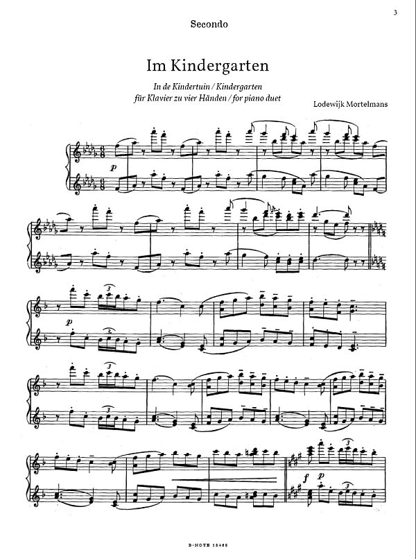 Children's Pieces Im Kindergarten / Kindergarten (4hd) Kinderwalzer / Childrens waltz Kindersuite Childrens suite I. Im Gleichschritt / On step II. Kinderlied / Childrens song III. Kinder-Parade / Childrens parade IV. Kleines Menuett / Little menuet V. Kinderfreude Childrens joy VI. Kleine Mazurka / Little mazurka VII. Einfach / Simplicity VIII. Ländlicher Walzer / Rustic waltz Primula Veris - Vier lyrische Stücke / Four lyric pieces: I. Adagio II. Moderato, semplice III. Molto animato IV. Animato