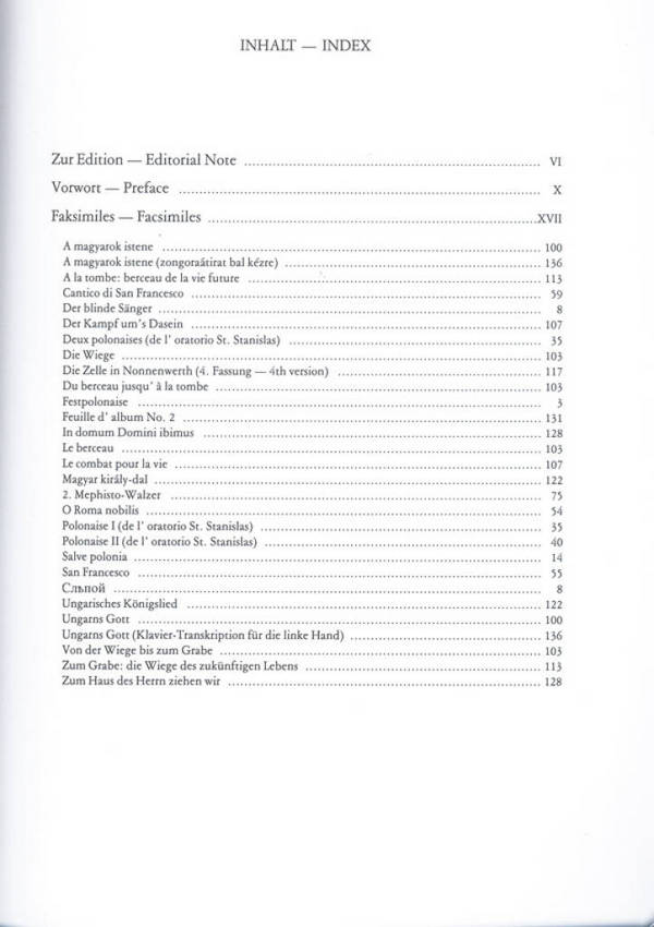 Sulyok Imre, ed Mezö, Imre, ed Festpolonaise Der blinde Sänger - Slepoj Salve Polonia Deux polonaises (de l'oratorio StStanislas) Polonaise I Deux polonaises (de l'oratorio StStanislas) Polonaise II O Roma nobilis San Francesco (preludio per il Cantico del Sol, di San Francesco d'Assisi) Cantico di San Francesco Mephisto-Walzer A magyarok istene - Ungarns Gott Von der Wiege bis zum Grabe - Du berceau jusqu' a la tombe Die Zelle in Nonnenwerth (4.Fassung) Magyar király-dal - Ungarisches Königslied In domum Domini ibimus - Zum Haus des Herrn ziehen wir Feuille d'album No (als 'Die Zelle in Nonnenwerth', 3. Fassung) Ungarns Gott - A magyarok istene (Klavier-Transkription für die linke Hand - zongoraátirat bal kézre)
