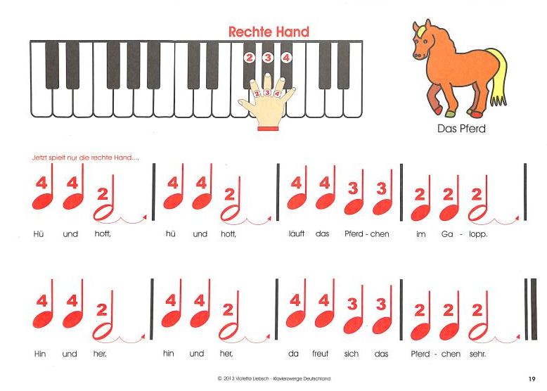 Klaviervorschule für Kinder von 4-6, - 19 Lieder und 19 Ausmalbilder, - Zahlensticker zum Aufkleben auf die Finger und Tasten, - 2 Silikon-Armbänder (rot und blau) zur Unterscheidung der Hände, - 6 Buntstifte, - 48 Seiten, - Querformat, Ringbindung, - in deutscher Sprache, Beschreibung: - spielerischer Einstieg in die Welt der Tasteninstrumente, - einfache Darstellung, leicht verständlicher Aufbau, - praxiserprobt mit Kindern und Eltern, - zu Hause, in der Kita, in der Musikschule, - schnelle Erfolge garantiert