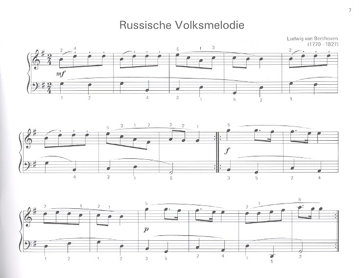 Bodenmann, Hans, ed Alter Tanz (Purcell) Russische Volksmelodie (Beethoven) Schwedischer Tanz Largo (Corelli) Menuett in G (Mozart) Aria (Bach) Menuett (Mozart) Menuett in F (Mozart) Menuett (Fischer) Menuett in g (Händel) Andante (Telemann) Menuett (Mozart) Allegretto (Czerny) Sonatina (Beethoven) Guten Abend, gut' Nacht (Brahms) Klav. 4-händig Deutscher Tanz (Mozart) Chor aus der Oper 'Die weiße Dame' (Boieldieu) Duett aus Figaros Hochzeit (Mozart) Deutscher Tanz (Beethoven) Tonleiter Übungen Akkord Übungen