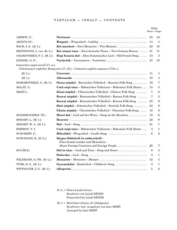 Denes, Laszlo, ed Mezoe, Imre, ed Nocturno Wiegenlied Zwei deutsche Tänze Altes französisches Lied Variationen Corrento Allemande Russisches Volkslied Böhmischer Volkstanz Chinesisches Volkslied Koreanisches Volkslied Schottisches Volkslied Ukrainisches Volkslied Lied auf der Wiese Lied Bourrée Böhmischer Volkstanz Idegen Über fremde Länder und Menschen Lied un Tanz Lied Menuette Kinderlied