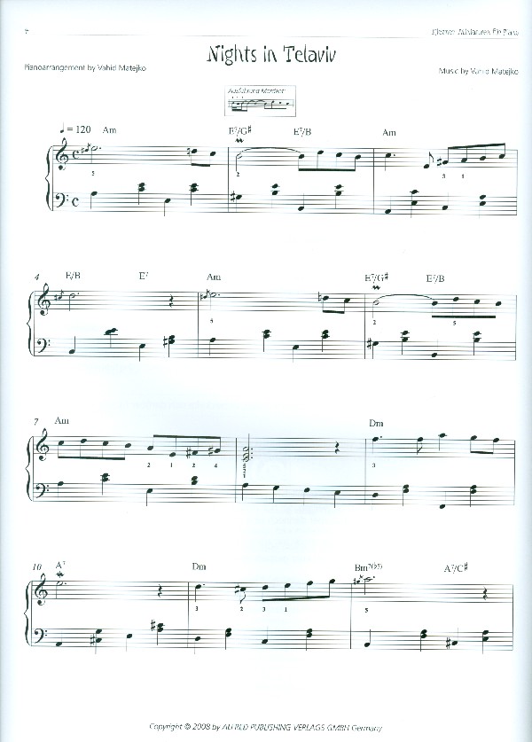 Achtsik Er Zibetzik Zi Bazar in the old City Days in Naharia Die grine Kuzine Freylekh Haklezmer Lama Sukkah Zu Lonely Gipsy Woman Naw Ruz Nights in Telaviv Rabi Haschem The Desert and the Death Sea The orange Juice Seller Trauriger Teddy V'tahér Libénu Die Klezmermusik ist durch ihre wohlgesanglichen und ausdrucksstarken Melodien schnell zu erkennen. Sie vermag gleichsam zu lachen und zu weinen. Sie hat Witz und Melancholie, kann in Trübsal oder Übermut ausbrechen, ist ungemein frisch, hat aber dennoch auch eine nachdenkliche Note. Komponist, Arrangeur, Pianist und Musikpädagoge Vahid Matejko, selbst deutsch-persisch-polnischer Abstammung, absolvierte sein Studium für Jazz-Komposition/Arrangement inKöln an der Hochschule für Musik. Wie kein anderer hat er in dieser Ausgabe attraktive Traditionalarrangements und Originalkompositionen im Klezmer-Stil zusammengetragen.Steigen Sie ein in die gleichermaßen melancholische und beschwingende Welt der Klezmermusik. Mit Vortragsvorschlägen und CD!