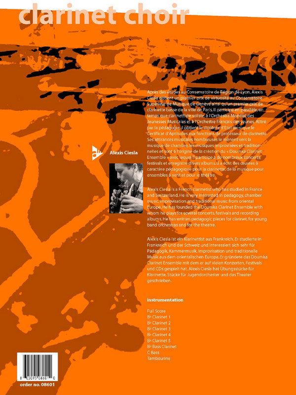 | Untertitel: | for clarinet ensemble (5, bass clar, C bass and tambourine) score and parts |