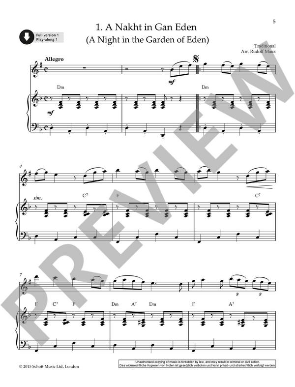 Mauz, Rudolf, arr. A Nakht in Gan Eden A Klezmer Overture Chossn Kalah Mazel Tov Yism' chu Hashamayim Unter einer Wolke Freilach Ki Mitziyon Ose shalom Melodie pour Dominique 7:40 AM Ele Chambda Libi Itamar Freilach Chassidic Dance Hrshel Yiddish Charleston Doina Bulgar Shalom Aleichem Boruch Ato Bo'ir Az der Rebbe est Hevenu Shalom Alejchem Hora Chsidl Bulgar Hava Nagila Yoshke Yoshke