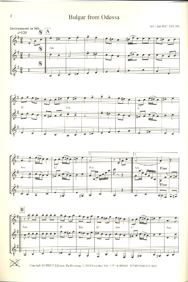 Let's play together Geuns, Jan M.C., arr. Bulgar from odessa Berdichiever Khosid Dance dance (Taants yidelekh tants) Silver Wedding (Die ziberne Khassene) Terk in America The wise Man's Song (Dem Tzadiks Zemerl) Klezmer Suite (Ale Brider/Der rebbe Elimeilekh/Yoshke furt aveg/Makheteinste maine) The Freilich of the Klezmer Sherele Russian Sher Halleluya