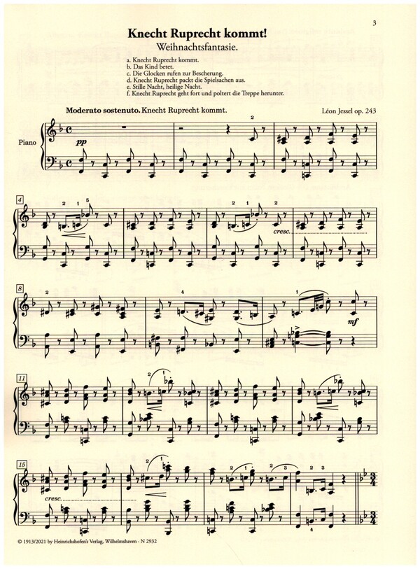 Weihnachtsfantasie Im Jahr 2021 jährt sich Léon Jessels Geburtstag zum 150. Mal. Aus diesem Anlass präsentiert der Heinrichshofens Verlag die bekannten Werke Jessels, aber auch einige Schätze aus dem Archiv, die erstmals seit langer Zeit wieder einem größeren Publikum zugänglich gemacht werden. Die Weihnachtsfantasie 'Knecht Ruprecht kommt!' stellt musikalisch dar, wie Nikolaus' Gehilfe aus dem Wald kommt und nicht bestraft, sondern Geschenke bringt. Die Bescherung wird durch Glocken eingeläutet und erreicht ihren Höhepunkt in 'Stille Nacht, heilige Nacht'. Danach geht Knecht Ruprecht wieder und poltert am Ende die Treppe herunter. Eine unterhaltsame und zugleich hochromantische Weihnachtsmusik.