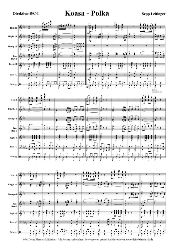 Polka Der 'Wilde Kaiser' ist ein markanter Gebirgszug im Tiroler Unterland und wird im Volksmund 'Koasa' genannt. Sepp Leitinger hat sich von der Landschaft und der einprägsamen Felsformation inspirieren lassen und eine Polka für Blasorchester geschaffen, welche die melodienführenden Register in luftige Höhen aufsteigen lässt. Wie immer schafft es der Salzburger Komponist und Arrangeur dabei, sein Werk aufregend und abwechslungsreich zu orchestrieren. Dabei bleibt die Polka auch für Amateure leicht spielbar.