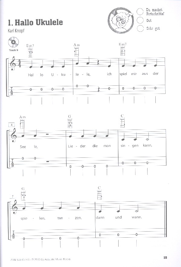 Ukulelenschule für Kinder Mit diesem Lehrwerk macht das Ukulelespielen richtig Spaß! Kinder ab sechs Jahren erlernen spielerisch und unterstützt vom Gesang das Melodiespiel auf dem Instrument und begleiten schon nach kurzer Zeit die Lieder mit einfachen Akkorden. Die Ukulele eignet sich für Kinder besonders gut als Einstiegsinstrument, denn sie ist auch für die Kleinen einfach zu handhaben. Ihre Saiten lassen sich einfach greifen, der Korpus ist klein und ihr Gewicht gering. Mit Hilfe von Tabulaturen, aber auch mit ersten Noten erlernen die Schüler Lieder, Spielstücke, Akkordbegleitung und Zupfmuster. Viele Lieder, ausschließlich mit deutschen Texten, ein großes Tabulatur- und Notenbild, humorvolle Illustrationen und die Begleit-CD sind kindgerecht und fördern die Motiviation. Auf spielerische Weise entdecken die Kinder musikalische Grundlagen und sind gut darauf vorbereitet sofern gewünscht zur Gitarre oder einem anderen Instrument zu wechseln. Noten und Tabulaturen, 80 Seiten, mit CD