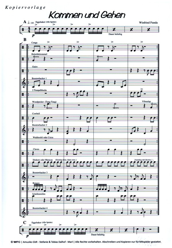 Winfried Funda Conceptions Zum Verlauf: Alle Spieler beginnen gleichzeitig mit dem Teil A (Eggshaker). Auf Zeichen des Dirigenten (evtl. nach 8 Takten) wechselt der 1. Spieler in den Teil B und beginnt mit dem Conga-Rhythmus. Auf Zeichen des Dirigenten ( evtl. nach 8 weiteren Takten) wechselt der 2. Spieler in den Teil B und beginnt mit dem Holzrührtrommel-Rhythmus. Dieses Verfahren setzt sich so lange fort, bis alle Spieler in Aufeinanderfolge und gleichen zeitlichen Abständen in den Teil B gewechselt haben. Nach beliebiger Dauer des gemeinsamen Spiels von Teil B, wechselt der 2. Spieler auf Zeichen des Dirigenten in den Teil C und beginnt wieder mit dem Eggshaker-Rhythmus. Auf Zeichen des Dirigenten wechselt nun auch der 3. Spieler in den Teil C. Dieses Verfahren setzt sich so lange fort, bis alle Spieler, bis auf den Conga- und die 4 Boomwhacker-Player, in Aufeinanderfolge und gleichen zeitlichen Abständen, in den Teil C gewechselt haben. Conga und Boomwhackers spielen, begleitet von den Eggshaker-Spielern, solange, bis auf Zeichen des Dirigenten die Boomwhacker-Spieler wie zuvor die übrigen Instrumente in der Reihenfolge ihres Einstiegs nun ebenfalls in den Teil C wechseln. Am Schluss spielt nur noch der Conga-Spieler, begleitet von sämtlichen Eggshaker-Spielern. Allmählich verliert sich auch der Klang der Conga und die Ausgangssituation ist wieder erreicht. Auf Zeichen des Dirigenten wird das Stück gemeinsam beendet.