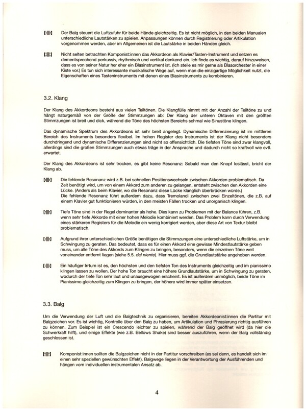 Inhaltsverzeichnis 1. Vorwort 2. Einführung und historischer Hintergrund 3. Grundlegende Informationen 3.1. Tonerzeugung 3.2. Klang 3.3. Balg 3.4. Artikulation 3.5. Notation 4. Manuale 4.1. Tonumfang 4.2. Rechte Hand (MI) 4.3. Linke Hand: Einzelton-Manual (MIII) 4.4. Linke Hand: Standard-Bass / Stradella-Bass Manual (MII) 5. Zeitgenössische Spieltechniken 5.1. Tonglissando 5.2. Knopf-Glissando 5.3. Vibrato 5.4. Bellows Shake 5.5. Dal niente 5.6. Cluster 5.7. Luftgeräusch 5.8. Perkussive Effekte 5.9. Weitere Möglichkeiten 6. Registrierung 24 6.1. Rechte Hand 24 6.2. Linke Hand 26 7. Kammermusik und Orchester 27 8. Neue Medien und Verstärkung 28 9. Diskographie & Bibliographie table of contents 1. Preface 2. Introduction & Historical background 3. Basic information 3.1. Tone production 3.2. Sound 3.3. Bellows 3.4. Articulation 3.5. Notation 4. Manuals 4.1. Range 4.2. Right hand manual (MI) 4.3. Left hand: Free-bass manual (MIII) 4.4. Left hand: Stradella bass / Standard bass manual (MII) 5. Contemporary playing techniques 5.1. Tone glissando 5.3. Vibrato 5.4. Bellows Shake 5.5. Dal niente 5.6. Clusters 5.7. Air sound 5.8. Percussive effects 5.9. More possibilities 6. Registration 6.1. Right hand 6.2. Left hand 7. Chamber Music and Orchestra 8. New Media and Amplification 9. Discography & Bibliography