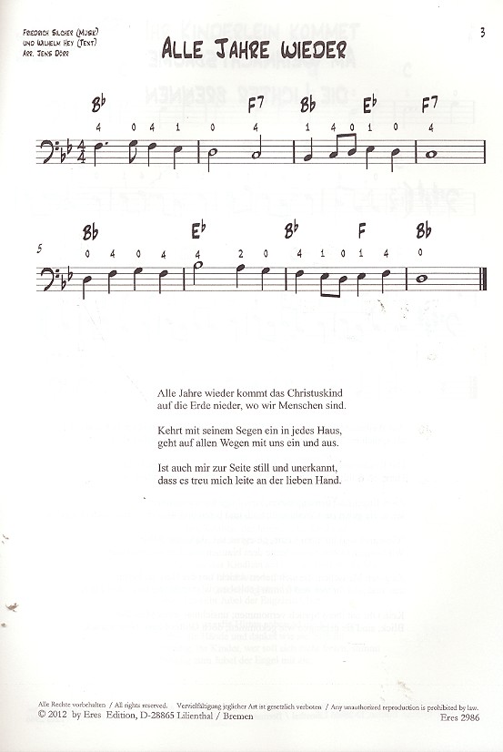 Dörr, Jens, arr. Sehr leichte Advents- und Weihnachtslieder in der halben und ersten Lage Alle Jahre wieder Am Weihnachtsbaume die Lichter brennen Ihr Kinderlein kommet Jingle Bells Kling Glöckchen kling Lasst uns froh und munter sein Leise rieselt der Schnee Morgen Kinder wird's was geben O du fröhliche Stille Nacht