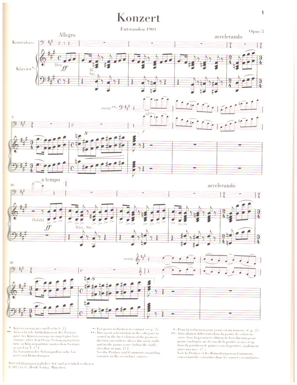Dank der geschickten Verbindung von romantischer Melodik und sprühender Virtuosität gehört Koussevitzkys Kontrabasskonzert op. 3 seit der Moskauer Uraufführung 1905 zu den populärsten Werken seiner Gattung. Kein Wunder, denn der virtuose Bassist Koussevitzky hatte es seinem Instrument geradezu auf den Leib geschrieben. Bereits 1906/07 erschien in Moskau ein erster Klavierauszug, dem 1910 ein zweiter in Leipzig folgte. Beide sind jedoch in der Solostimme so fehlerhaft, dass bis heute an vielen Stellen Unsicherheit über den korrekten Notentext besteht. Kontrabassist Tobias Glöckler stellt seine Urtextausgabe daher auf eine breite Basis: Neben dem handschriftlichen Aufführungsmaterial und den zu Lebzeiten des Komponisten erschienenen Klavierauszügen zieht er auch Tonaufnahmen mit Koussevitzky als Solisten heran und liefert damit endlich eine fundierte Urtextausgabe von Orchesterpartitur und Klavierauszug dieses Klassikers der Kontrabass-Literatur. Wie bei allen Kontrabasskonzerten im Henle-Verlag bietet auch diese Ausgabe den Klavierauszug von Christoph Sobanski in zwei Tonarten (e-moll und fis-moll), für die Ausführung in Solo- oder Orchesterstimmung.