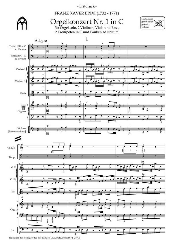 | Untertitel: | für Orgel, 2 Violinen, Viola und Bass, 2 Trompeten in C und Pauken ad Partitur |