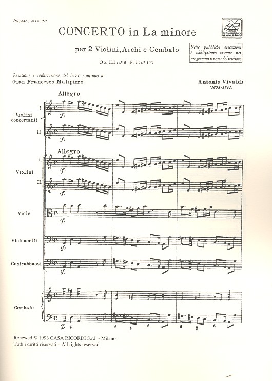 F.I:177 Op.3,8 RV522 P2 Malipiero, Gian Francesco, ed Concerto la minore