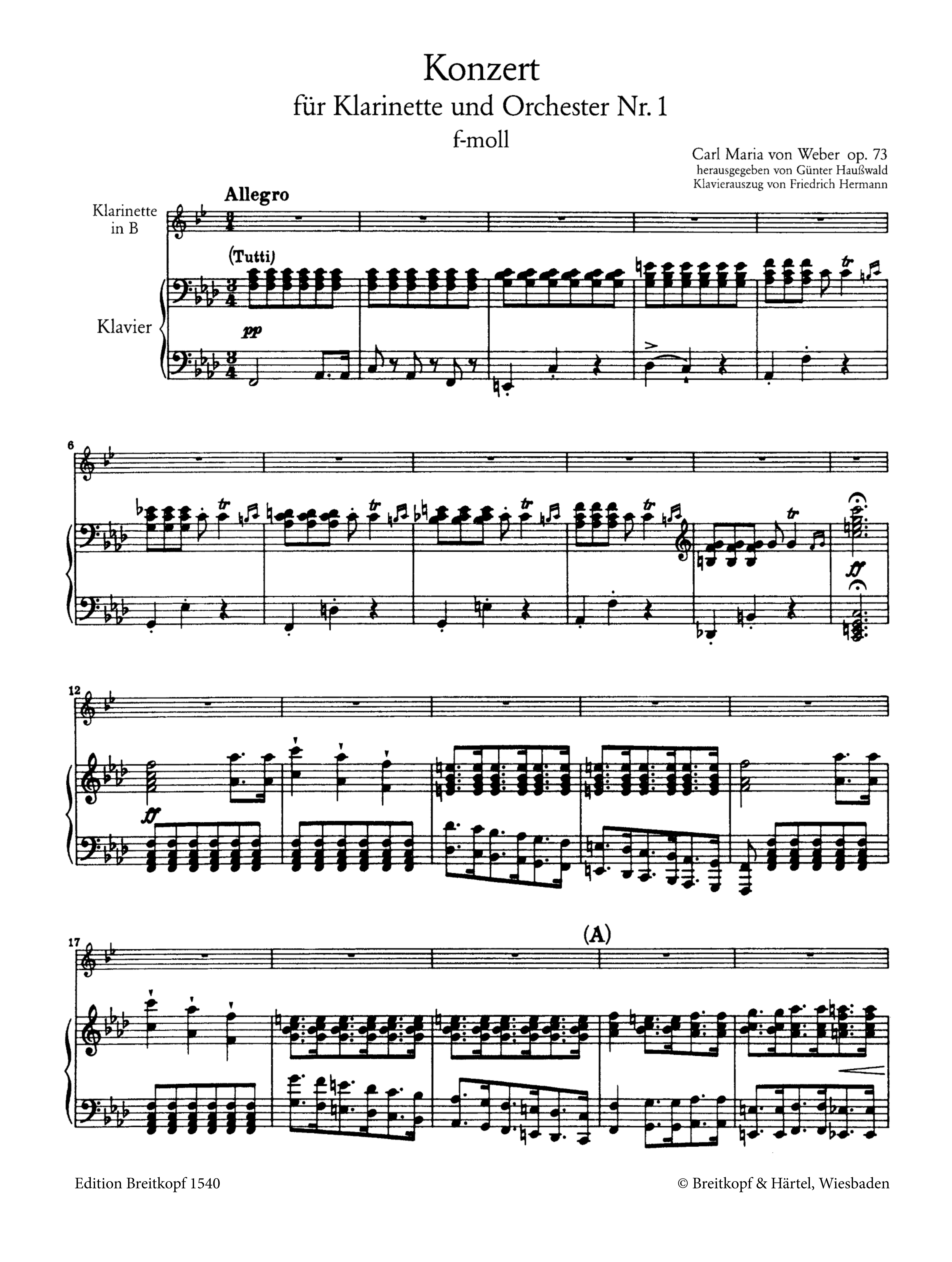 Hermann, Friedrich, ed Hausswald, Günter, ed Carl Maria von Weber schrieb sein Klarinettenkonzert f-moll 1811 im Lauf weniger Wochen für Heinrich Joseph Baermann (17841847), dem Klarinettisten der Münchner Hofkapelle, dem das Werk auch gewidmet ist. Die Uraufführung fand am 13. Juni 1811 in München mit großem Erfolg statt. Im Druck erschien das f-moll-Konzert erst 1822. Das Werk weist die klassische dreisätzige Form auf. Außergewöhnlich sind dabei zwei kleine hochromantische Kammermusiksätze für Klarinette und Horntrio, die den Mittelteil und die Schlusstakte des Adagios darstellen. Hauptquelle der vorliegenden Urtext-Ausgabe ist das Autograph. Der Anhang enthält die Kadenz Baermanns zum ersten Satz sowie die beiden erwähnten Hornpassagen in einer aufführungspraktischen Streicherbearbeitung des Komponisten.