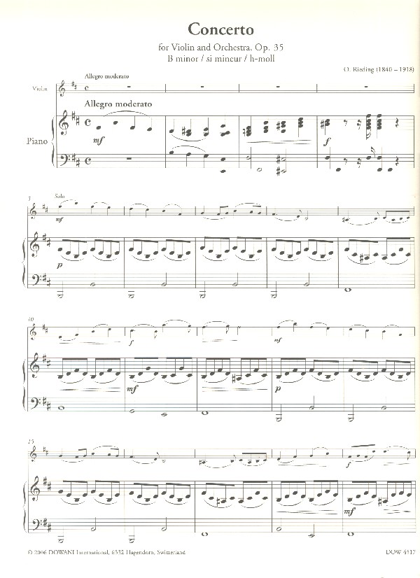 3 tempi playalong Der deutsche Geiger Oskar Rieding ist bis heute bekannt für seine leichten Violinkonzerte für Anfänger. Das bekannteste davon ist das Konzert für Violine und Orchester op. 35 in h-moll, welches zum Repertoire eines jeden Geigenschülers gehört.Das Konzert kann ausschließlich in der 1. Lage gespielt werden, fortgeschrittenere Schüler können jedoch einige Passagen auch in der 3. Lage spielen. Es handelt sich um eine revidierte Neuausgabe mit Klavierauszug und einer neuen Solostimme mit Fingersätzen. Diese Ausgabe wurde von dem renommierten Violinpädagogen Herbert Scherz herausgegeben, der viele Jahre als Professor für Violine und Violinmethodik an den Musikhochschulen in Luzern und Zürich tätig war. Die bewährte Dowani 3 Tempi Play-Along Ausgabe ermöglicht es Ihnen, das Werk systematisch und in drei verschiedenen Tempi mit professioneller Begleitung zu erarbeiten. 1-4 Allegro moderato 5-8 Andante 9-12 Allegro moderato