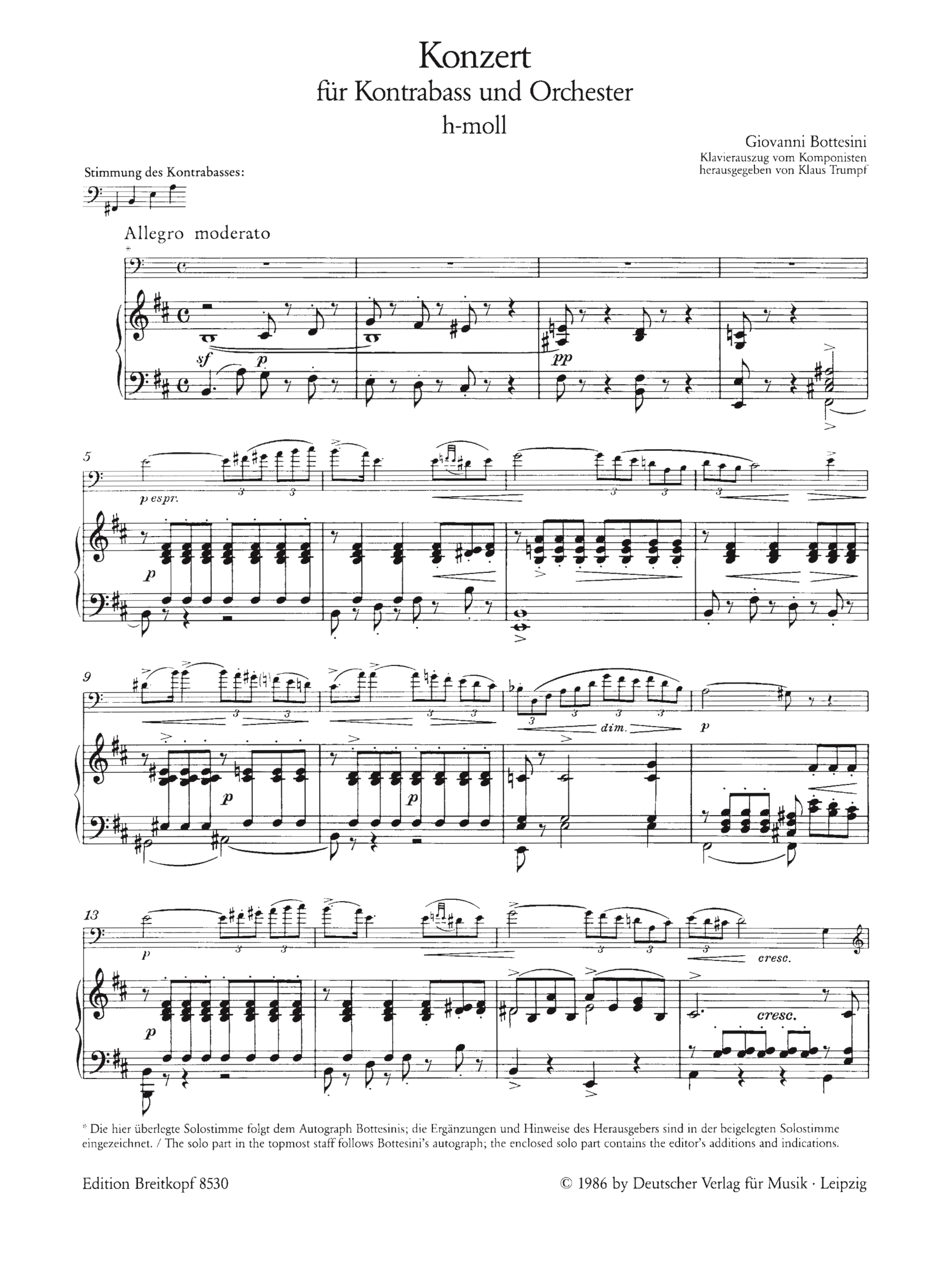Trumpf, Klaus, ed Seine Solokonzerte sind ausgewachsene dreisätzige Werke und bieten dem mit Originalliteratur nicht eben verwöhnten Kontrabassisten alle Spieltechniken, die sein Herz begehrt. Unsere Ausgaben basieren auf den autographen Quellen. Die Solostimme ist jedoch mit Bogenstrichen und Fingersätzen für den praktischen Gebrauch eingerichtet.