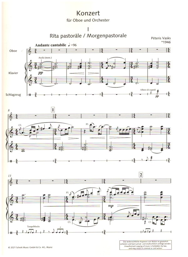 Sein Oboenkonzert komponierte Pteris Vasks anlässlich der Hundertjahrfeier der lettischen Unabhängigkeit, und so geriet ihm das Stück zur Hymne auf seine Heimat, ihre Natur und ihre Menschen. Zugleich erfüllte er damit Albrecht Mayers langjährigen Wunsch nach einem Solokonzert. Zwei Pastoral-Sätze umrahmen das Stück: Im ersten, einer morgendlichen Naturszene, breitet die Oboe langgezogene Kantilenen über Streichertremoli und Vogelstimmen in den Holzbläsern aus. Auf den kontrastreichen Mittelsatz mit seinen feurigen Volkstänzen, Arioso-Passagen und der ausgedehnten Kadenz folgt eine Abend-Pastorale: Ihre dramatische Stimmung mündet schließlich in die friedvollen Naturbilder des Anfangs. I Rta pastorle (Morgenpastorale / Morning pastoral) II Scherzando III Vakara pastorle (Abendpastorale / Evening pastoral)