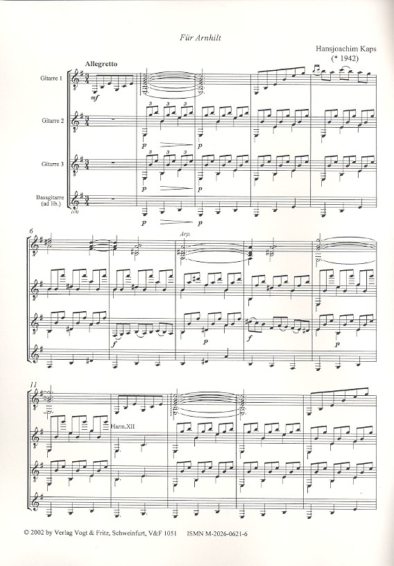 | Untertitel: | für Gitarrenquartett oder Ensemble Partitur und Stimmen |