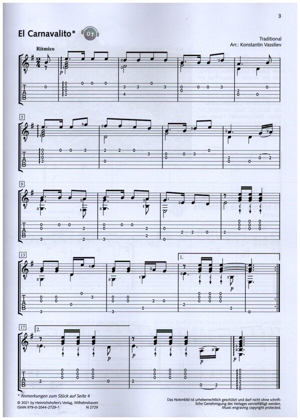 30 Meisterstücke leicht arrangiert. Noten und Tabulatur In unserer kleinen Auswahl möchten wir die Vielfältigkeit der lateinamerikanischen Musik unterstreichen. Neben den Originalwerken für Gitarre findet man hier eine ganze Reihe Folklorestücke: Die Volkstänze der Anden, den leidenschaftlichen Tango Argentino, die schwungvollen mexikanischen Walzer und Corrido oder die rhythmusbetonten kubanischen Guajira und Habanera. Einen besonderen Platz nimmt die brasilianische Musik mit den energiegeladenen Tänzen wie Samba, Choro, Maxixe sowie mit der sentimentallyrischen Modinha ein. Trotz aller regionaler Unterschiede zeichnet sich die Musik durch die enorme Ausdruckstärke, charakteristische tänzerische Eigenschaft und vor allem durch ihre strahlende Lebensfreude aus. - El Carnavalito (Trad.) - El arroyo que murmura (Jorge Anckermann) - Lua Branca (Chiquinha Gonzaga) - Cielito lindo ( Trad.) - Casinha Pequenina (Trad.) - Firmeza (Hilarión Leloup) - Vidalita (Hilarión Leloup) - Zamacueca (Hilarión Leloup) - Huella (Hilarión Leloup) - Milonga (Hilarión Leloup) - La Cucaracha (Trad.) - La Sandunga (Trad.) - La Llorona (Trad.) - Canto (Julio S. Sagreras) - Sabiá (José Barbosa da Silva) - È Abre Alas (Chiquinha Gonzaga) - La Bamba (Trad.) - El Choclo (Ángel Villoldo) - Arrependida (Américo Jacomino) - Valsa Brasileira (Quincas Laranjeiras) - Por ti aprendí a querer (Lorenzo Barcelata) - Mentiroso (Américo Jacomino) - Romanza (Antonio Jiménez Manjón) - Menuett Nr. 50 (Pedro Ximénez Abril Tirado) - El Jazmín (Lorenzo Barcelata) - Mi NocheTriste (Samuel Castriota) - Abismo de Rosas (Américo Jacomino) - Carioca (Ernesto Nazareth) - Dalia (Pedro Antonio Iparraguirre) - Tú (Eduardo Sánchez de Fuentes) Alle Kompositionen sind leicht bearbeitet, so dass sie für Schüler der unteren Mittelstufe mit ca. 3 Jahren Unterrichtserfahrung geeignet sind. Jedes Stück wird mit einem Text begleitet: Hier gibt es allerlei Wissenswertes über Musik, Infos zu den Komponisten und Übungstipps. Ergänzend zu der traditionellen Notation mit ausreichenden Angaben zu den Fingersätzen kann auch die Tabulatur für die bessere Orientierung in den höheren Lagen hilfreich sein.
