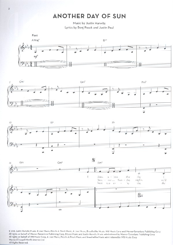 Pasek, Benjamin, lyrics Paul, Justin, lyrics Winner of 7 Golden Globes Awards 2017 Music from the Motion Picture Soundtrack Another Day of Sun Someone in the Crowd Mia & Sebastian's Theme A Lovely Night City of Stars Planetarium Start a Fire Engagement Party Audition (The Fools Who Dream) Epilogue