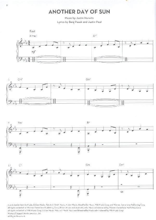 Music from the Motion Picture Soundtrack 10 Songs and Themes from the Hit Movie arranged for intermediate piano Another Day of Sun Someone in the Crowd Mia & Sebastian's Theme A lovely Night City of Stars Planetarium Start a Fire Engagement Party Audition (The Fools who dream) Epilogue