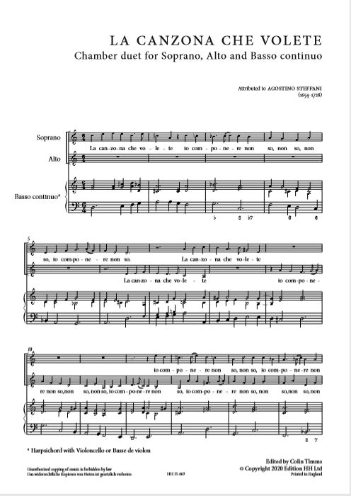 The humorous text of the duet refers to a madrigal and is redolent of Steffani?s wit. The chamber duet is the form by which the composer was best known, and La canzona is an accomplished example, displaying effortless counterpoint in the duet movement and technical ingenuity in the two solos, built on related ground basses. There are good reasons, therefore, for attributing this piece to Steffani.