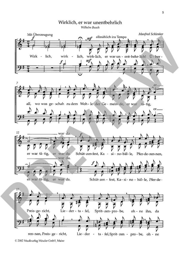 Chorsätze nach Wilhelm Busch Nr.2 Die Selbstkkritik hat viel für sich Wirklich er war unentbehrlich Sie war ein Blümlein frisch und fein Es flog einmal ein muntres Fliegel Die Liebe war nicht geringe Es sitzt ein Vogel auf dem Leim