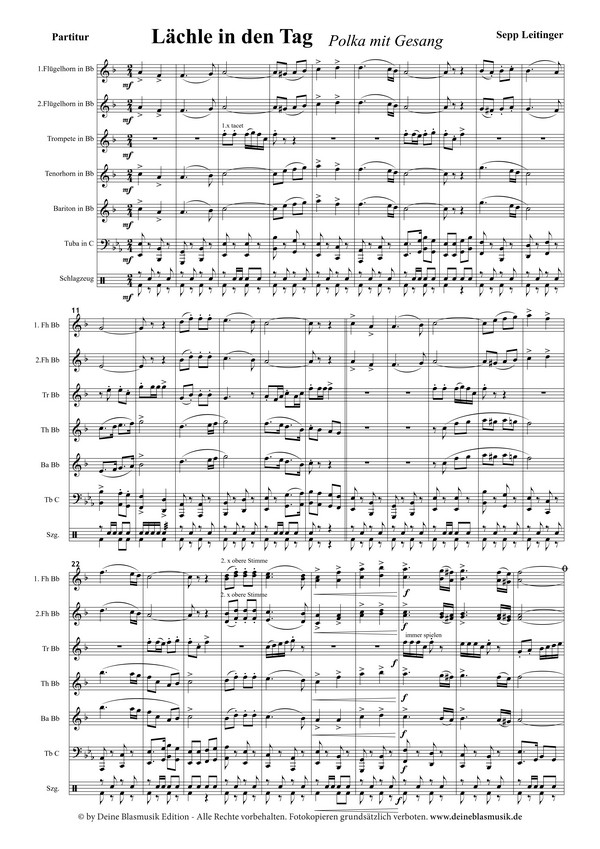 Polka 'Lächle in den Tag' ist viel mehr als der Name dieser böhmischen Polka für Blasorchester - es ist das Lebensmotto des Komponisten Sepp Leitinger und des Textdichters Erwin Loier. Der Text strotzt vor Optimismus und setzt ein Zeichen der Hoffnung. Die großen Melodienbögen, die sich im Trio euphorisch erheben, reißen mit und bleiben sofort im Ohr des Zuhörers.