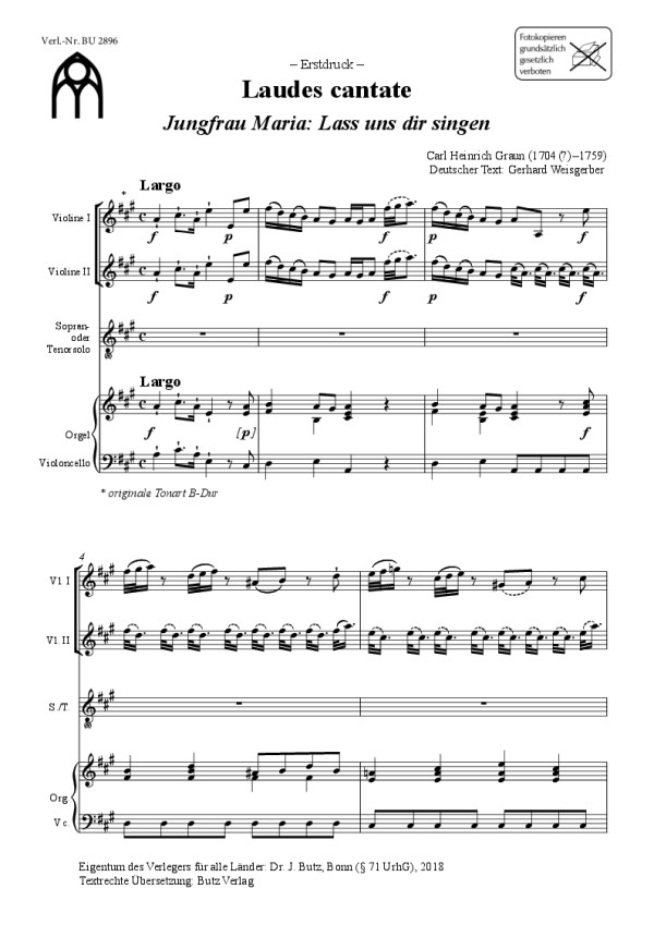 | Untertitel: | für Sopran (Tenor), 2 Violinen und Bc Partitur und Stimmen (Bc ausgesetzt) (st/la) |